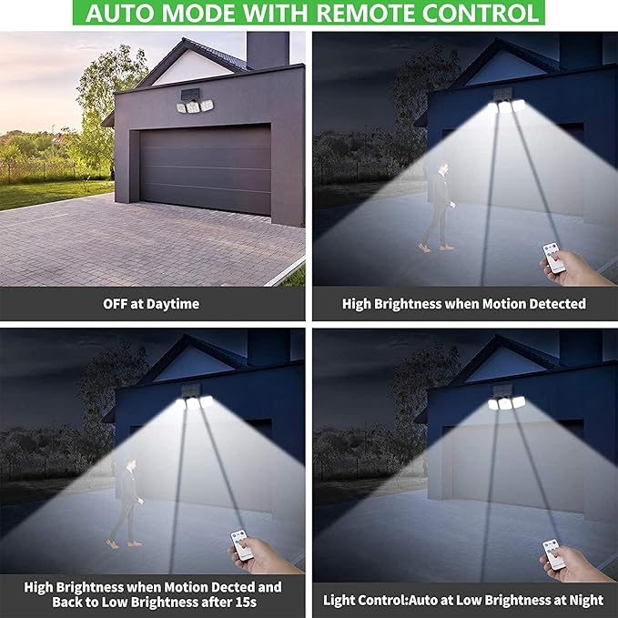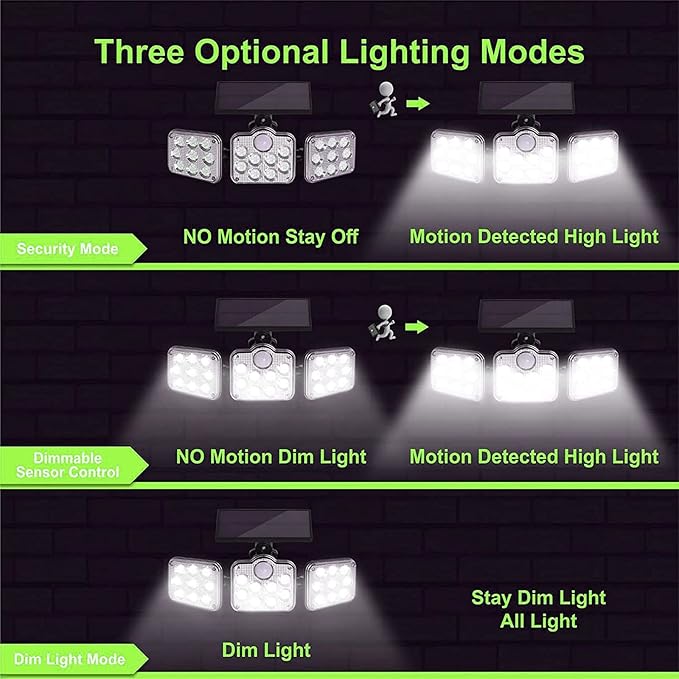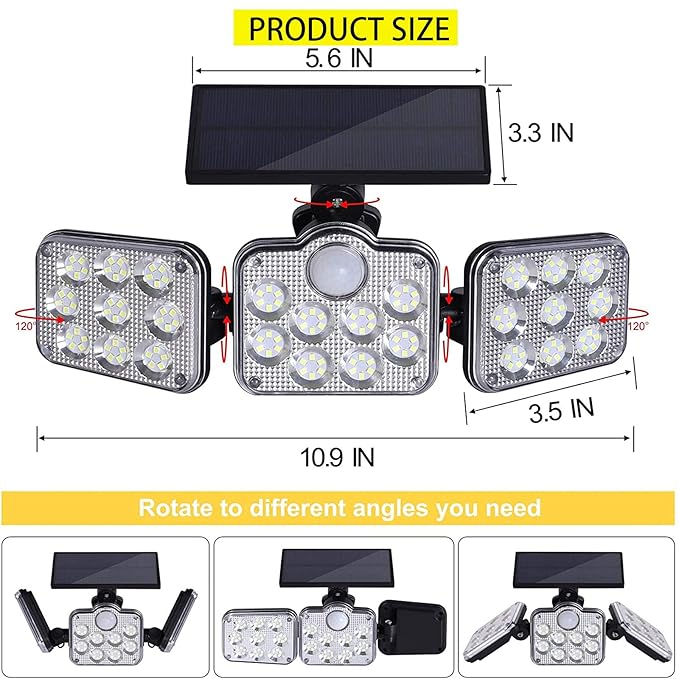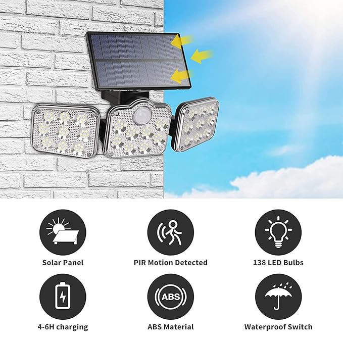 🔆 كشاف طاقة شمسية مع حساس حركة – 138 ضو LED، 3 روس متحرّكين