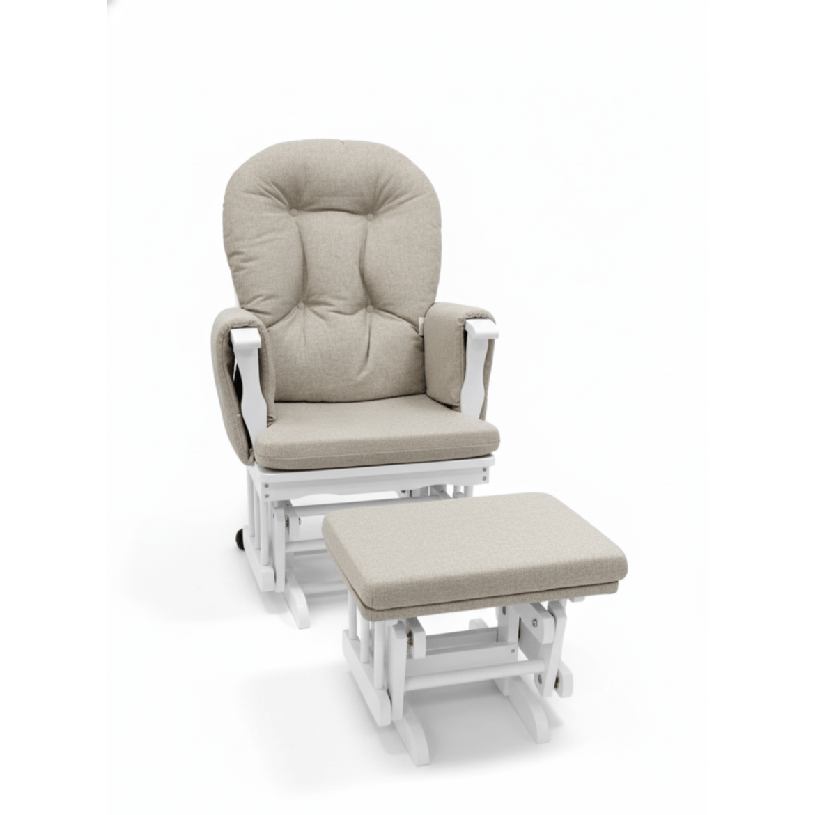 Miila Canvas Nursing Chair - Beige brings soothing comfort and style to your nursery with its adjustable backrest and matching foot stool. The soft canvas upholstery ensures a gentle, durable touch, while thick padding on the seat, arms, and foot stool delivers exceptional relaxation for feeding or bonding moments. The wooden glider base provides smooth, quiet rocking, making this set a practical and charming addition to any baby room.