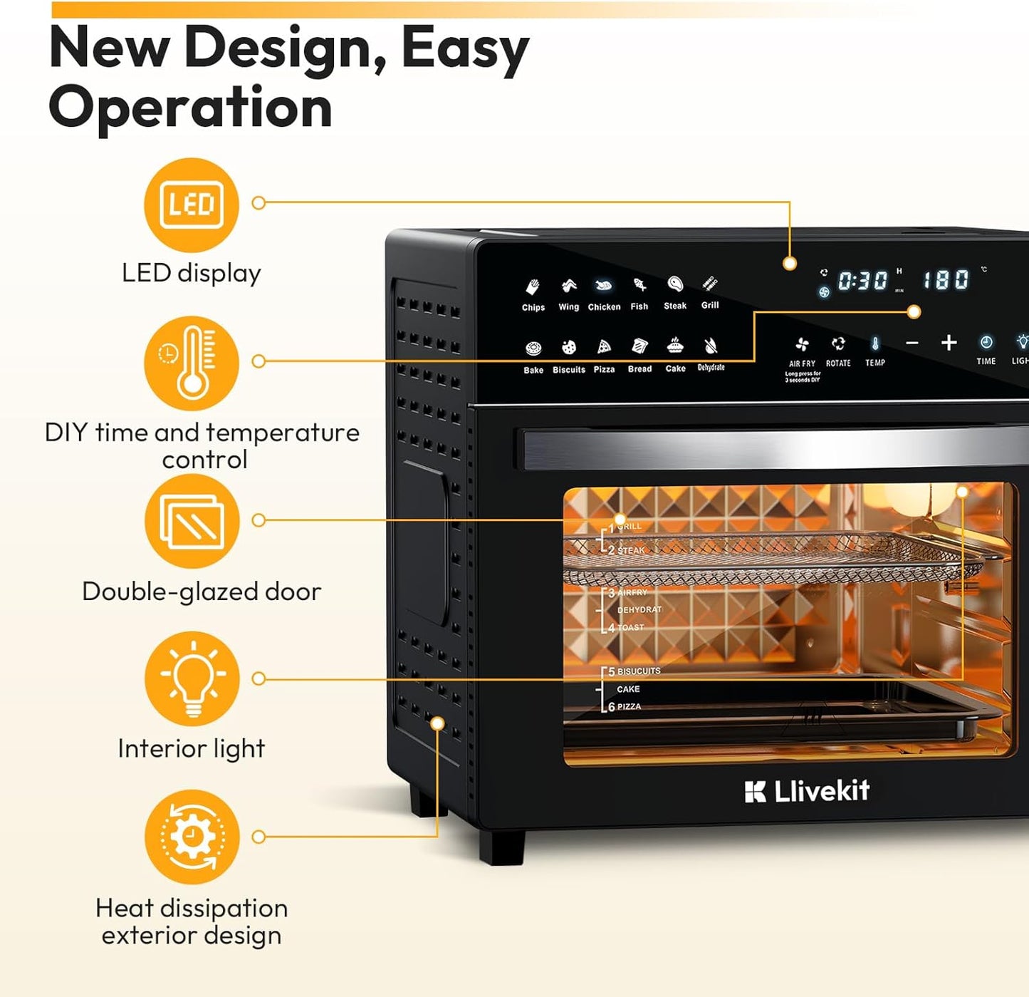 - „ÄêAll in One„Äë A fryer, oven, dehydrator and electric oven in one, LLIVEKIT 1700W hot air fryer oven with 14 pre-programmed functions can prepare healthy, delicious dishes in a less greasy, quicker way. It makes you a chef who is happy with his specialities, such as chips, chicken wings, roast chicken, fish, steak, shrimps, dried fruit, desserts, biscuits, pizzas, bread, cakes, kebabs