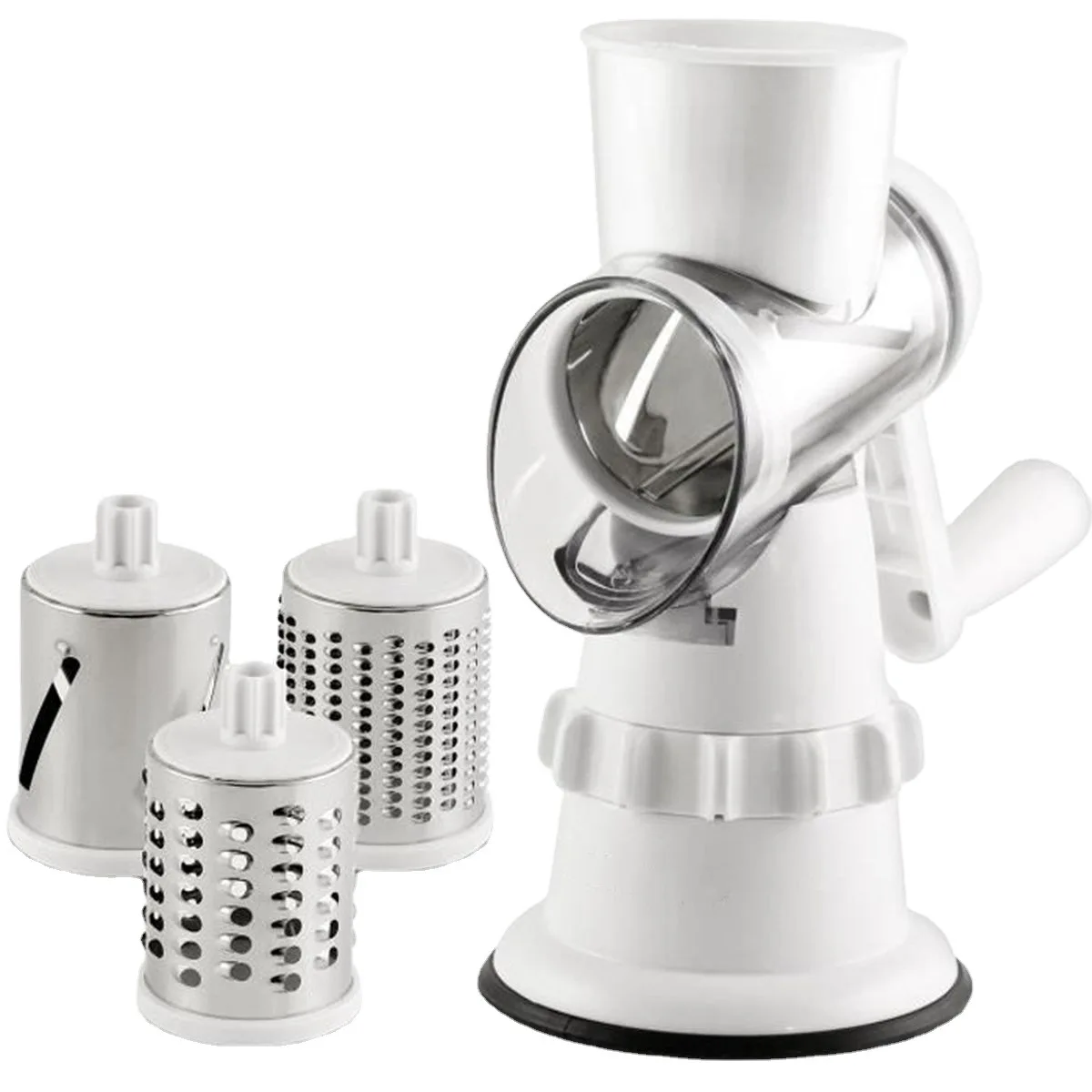 Description:Rotary grater with 3 stainless steel blades, anti-clog angled dispenser, and strong suction base. Designed for efficient slicing, shredding, and grating with minimal effort. All parts are detachable for easy cleaning.Features: