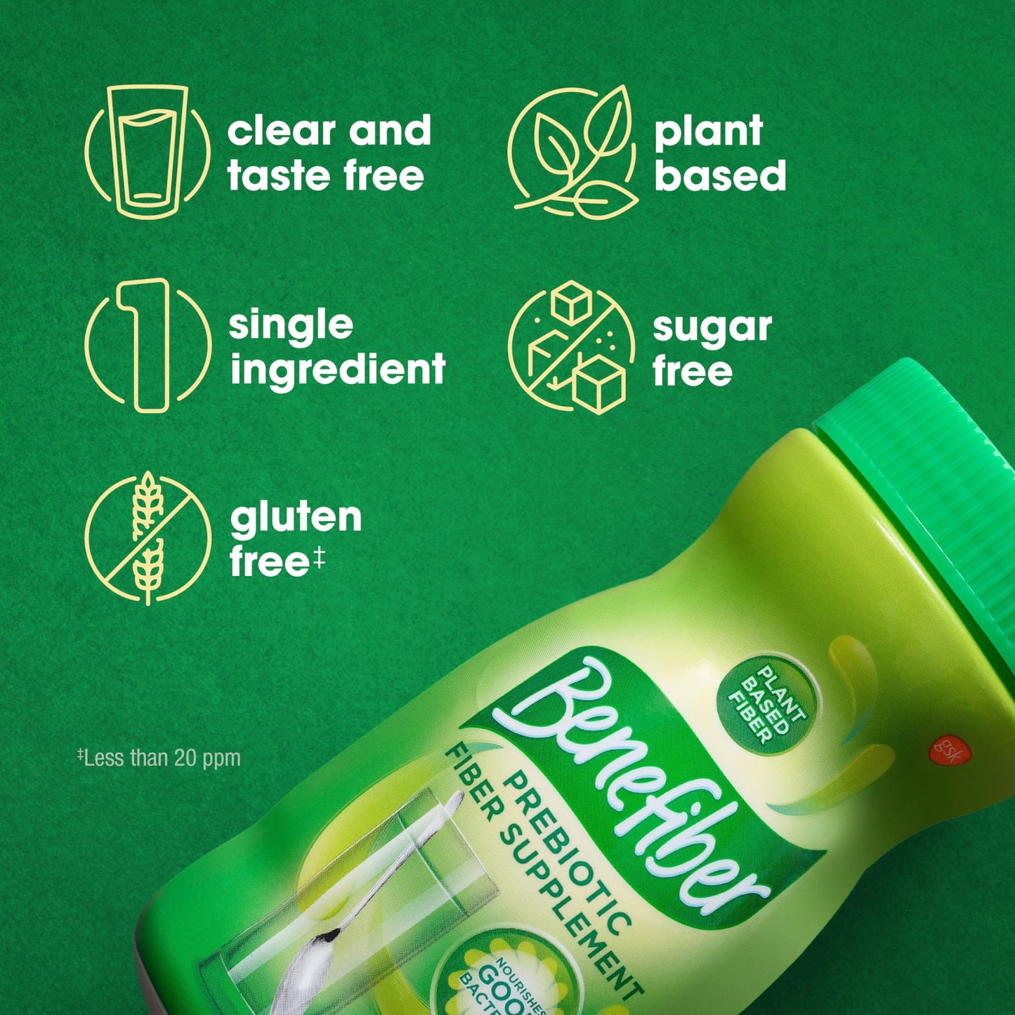 Details: Benefiber Daily Prebiotic Fiber Supplement Powder is designed to strengthen and nourish the good bacteria, helping support your digestive health (1). A source of daily fiber, this unflavored powder contains the plant based fiber wheat dextrin to help nourish the good bacteria in your digestive system (1)(2). Sugar-free, gluten-free, taste-free and grit free, this clear fiber powder dissolves completely in foods and non-carbonated beverages like water, coffee or juice, so you can enjoy all the benefits of prebiotic fiber supplements in a variety of foods and beverages (3). For ages 12 and older, stir two teaspoons of Benefiber prebiotic fiber powder into four to eight ounces of a non-carbonated beverage or soft food three times daily. For children ages 6 to 11, use one teaspoon of this prebiotic powder three times daily. Benefiber makes taking fiber easier. (1) These statements have not been evaluated by the Food and Drug Administration. This product is not intended to diagnose, treat, cure or prevent any disease. (2) The wheat has been processed to allow this food to meet the Food and Drug Administration (FDA) requirements for gluten-free foods. (3) Not recommended for carbonated beverages. Use as directed.