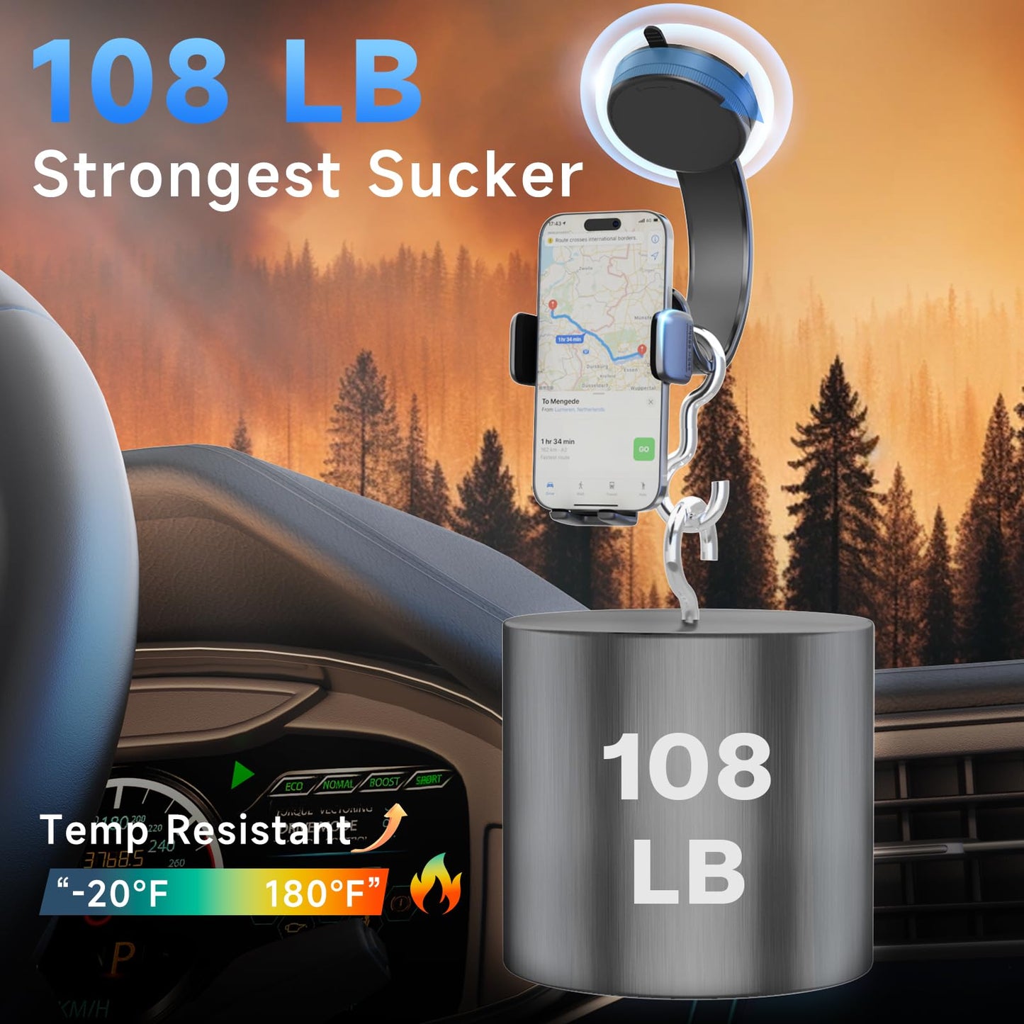- Ultra-Strong Suction: Tired of your phone holder falling? Our nano gel suction cup mount generates a massive 108LBS of force, which is superior to the press-type suction cup! It locks securely to your dashboard or windshield, enduring potholes without ever falling down. Suitable for use in a temperature range of -20°F to 180°F
