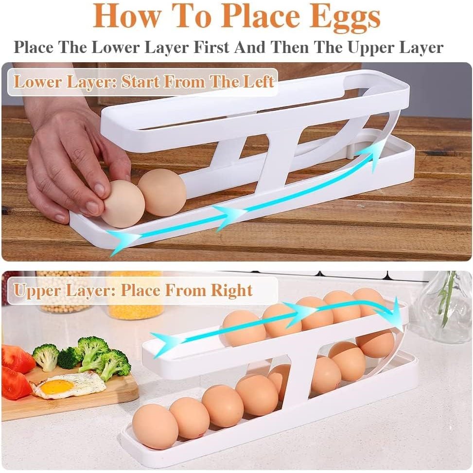 It's designed with 2 tiers that can hold up to 14 eggs, with a small footprint saves fridge space, and keeps eggs in order.