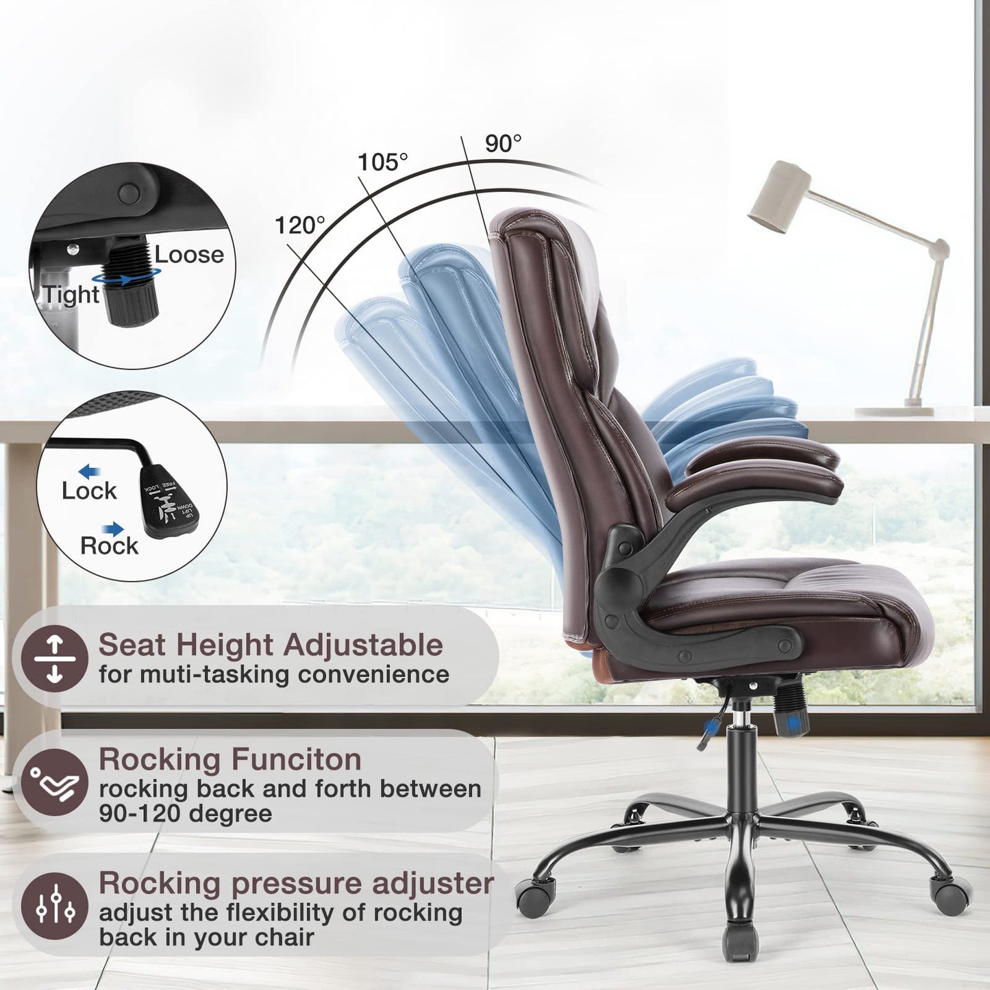 - Adjustable Height Desk Chair - The height of the chair back can be adjusted to 18"-22" through the handle, which is suitable for adults and teenagers to work and rest. The reclining device can adjust the angle of the seat back by 90°-120°, and can enter the rocking and locking mode, which is suitable for different sitting positions.