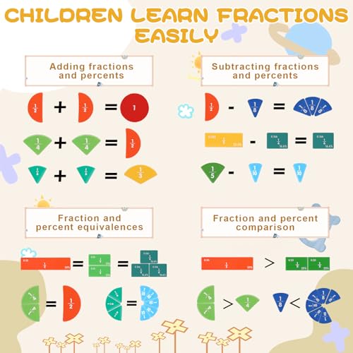 - Includes a variety of shapes and colors to facilitate fraction understanding and problem-solving skills.