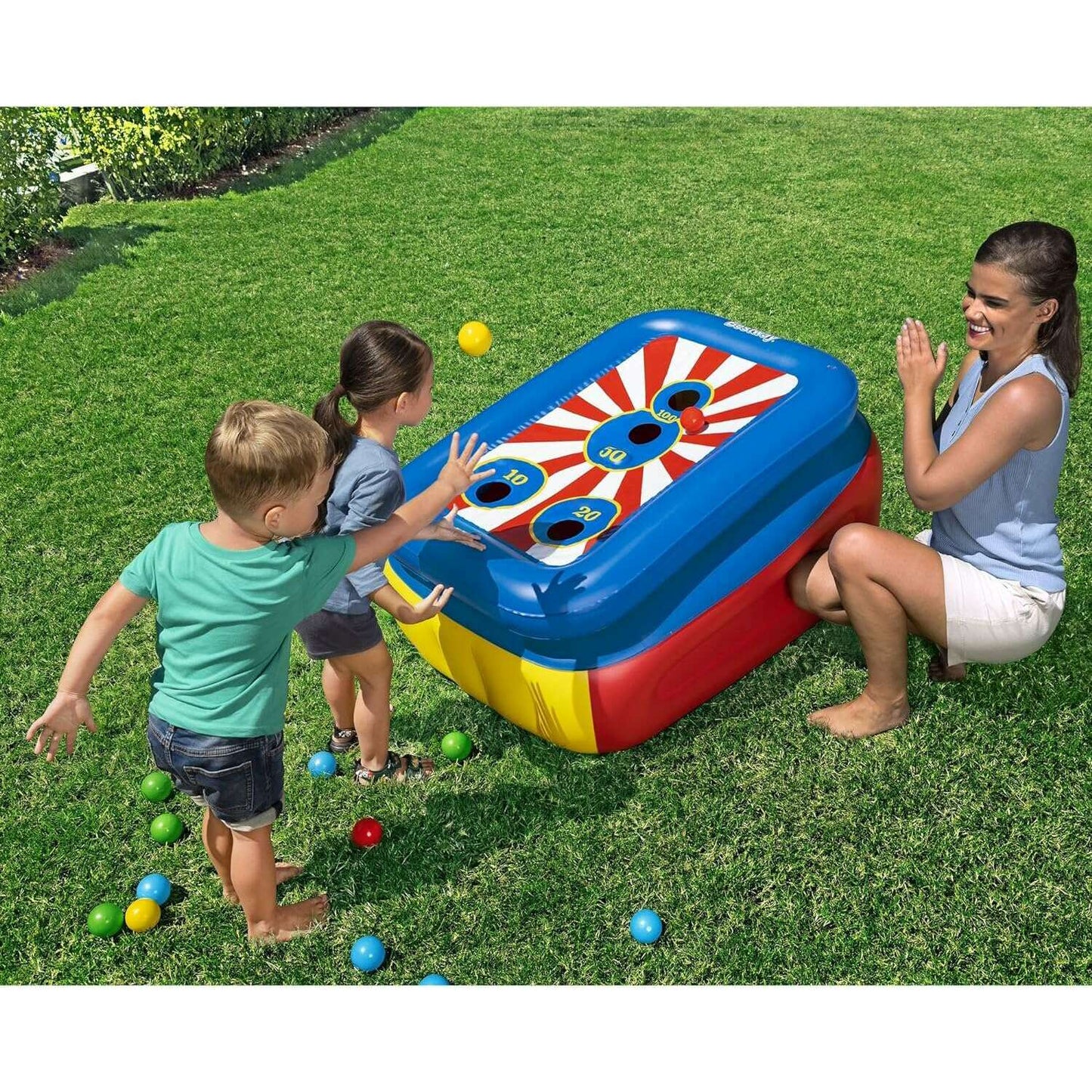 - With the lid open, use as a ball pit where kids can toss balls through the hoop and open holes; with the lid closed, toss balls into the holes to score points.