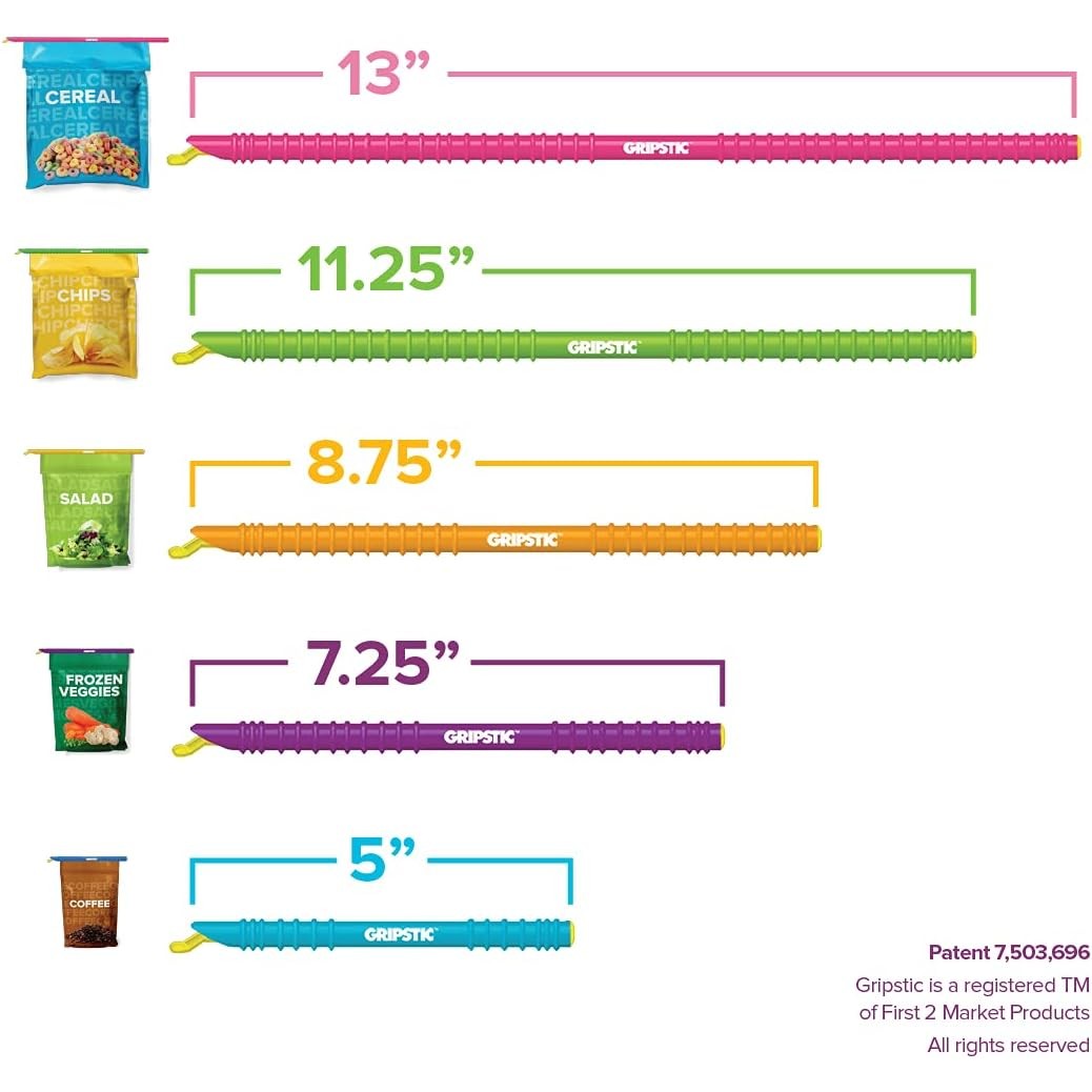 EASY TO USE : Fold the bag over 1x and slide the GRIPSTIC across the bag. Color-coded in 5 sizes to seal everything from kids snacks to family size frozen vegetables. Freezer safe and dishwasher safe.