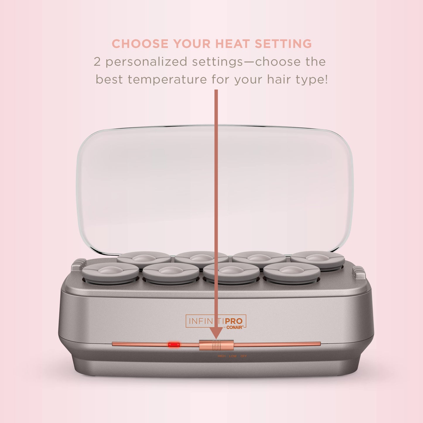 Details: Less frizz. More body. Perfect curls. Get it all, quickly and easily, with the 8 Volume & Shine Rollers from the InfinitiPRO by Conair Luxe Series. This innovative set of hot rollers is equipped with a true ionic generator that banishes frizz and seals in moisture for silky, smooth, healthy-looking results. Perfect for forming loose, flowing curls and waves, the two-inch-diameter jumbo rollers are specially designed for maximum comfort and control and come with easy-to-use plastic super clips to hold and set your style. Choose from 2 settings to customize heat for your hair type. The ceramic-flocked rollers heat up in just 85 seconds with even heat for consistent curling from start to finish. Salon results at home made easy!