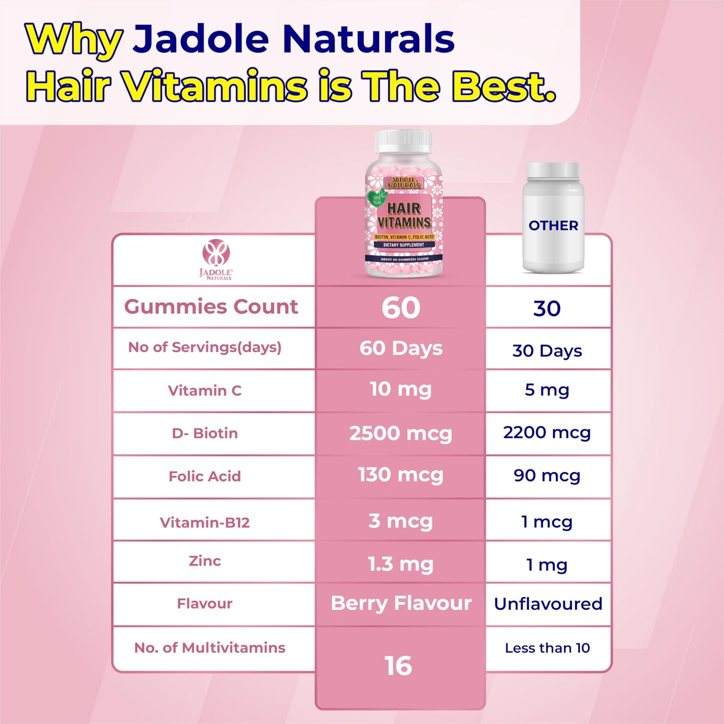 Jadole Naturals Hair Vitamins 60 Gummies Supplement with Vitamin C, Biotin & Folic Acid Supports Hair Growth, Hair Loss, Healthy Hair, Skin & Nails | Hair Multivitamins Supplements for Men Women's