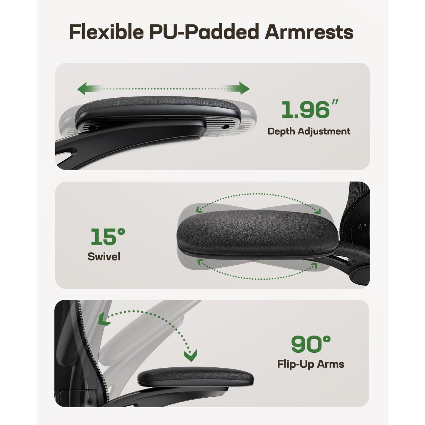 - Flexible Armrests: Move smoothly rounded PU-padded armrests forward or back and swivel them left or right to find the optimal arm position. Flip the armrests up when you want more freedom or to easily slide the ergonomic chair under the desk.