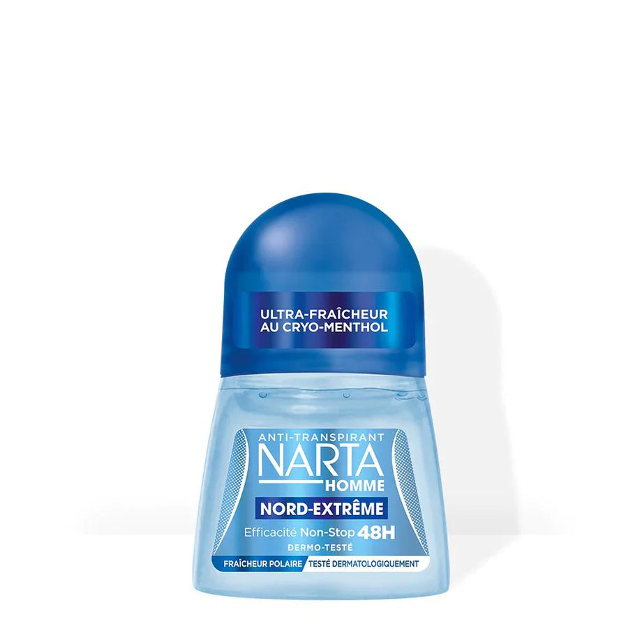 NARTA North extreme antiperspirant roll-on deodorant for Men offers an ultra-fresh effectiveness for 48-h non-stop. Its cryo-menthol formula and its unique scent ensures a long-lasting freshness and protects your skin against odors and humidity. Its formula respects your skin and the natural mechanism of perspiration. Dermatologically tested.