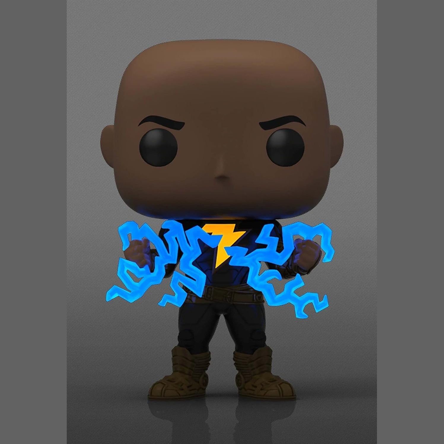 Description: This Pop figure depicts Black Adam without a cape and with a lighting chest effect, showcasing the character's electrifying appearance. Black Adam is a powerful and sometimes antiheroic character in the DC Universe.