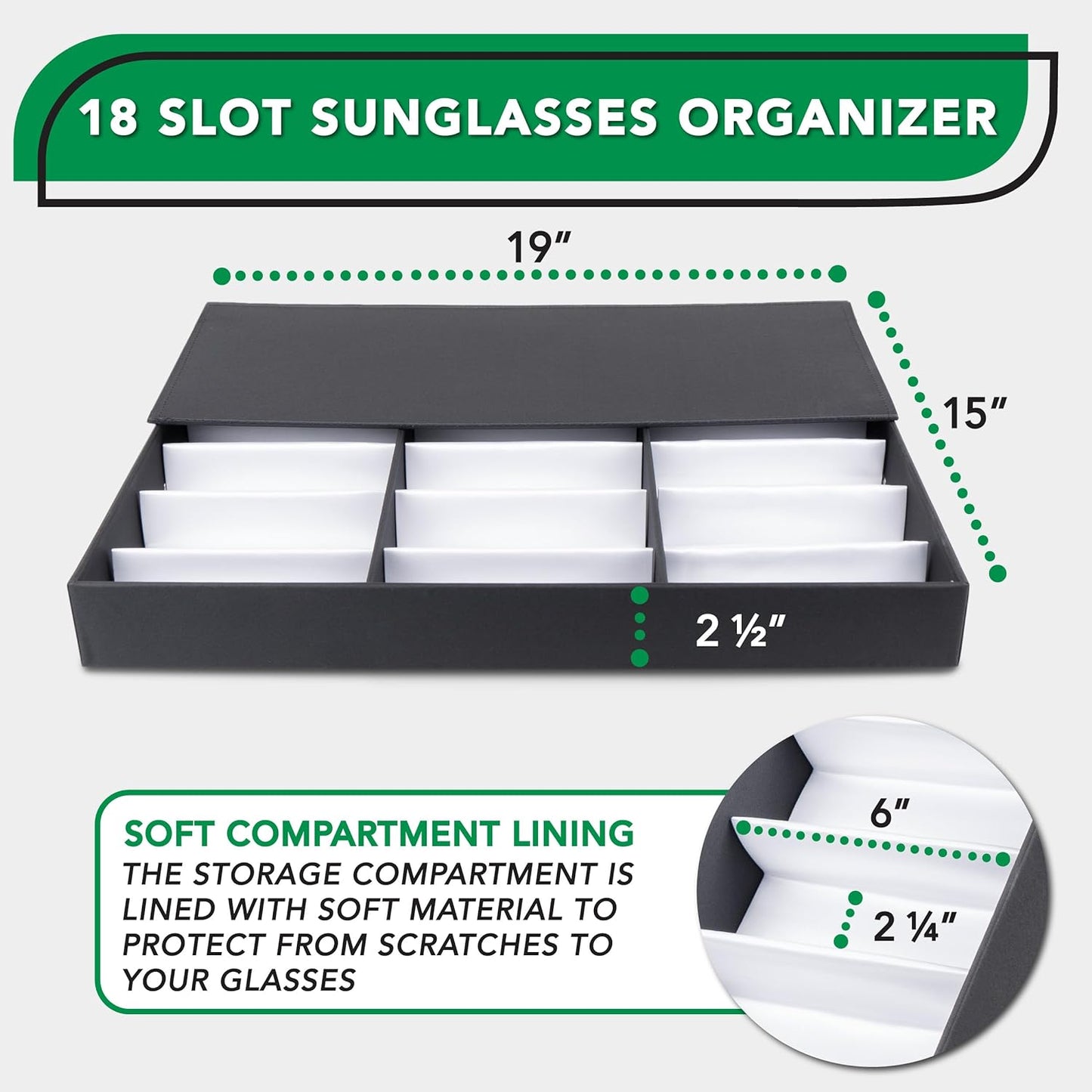 - FITS MOST – All 18 slots that measure 6”L x 2.25”W x 2.25”H and fit most sunglasses and watch sizes without extra space for items to slide around. Each slot is deep enough to prevent your items from poking out and unable to close the lid for storage.