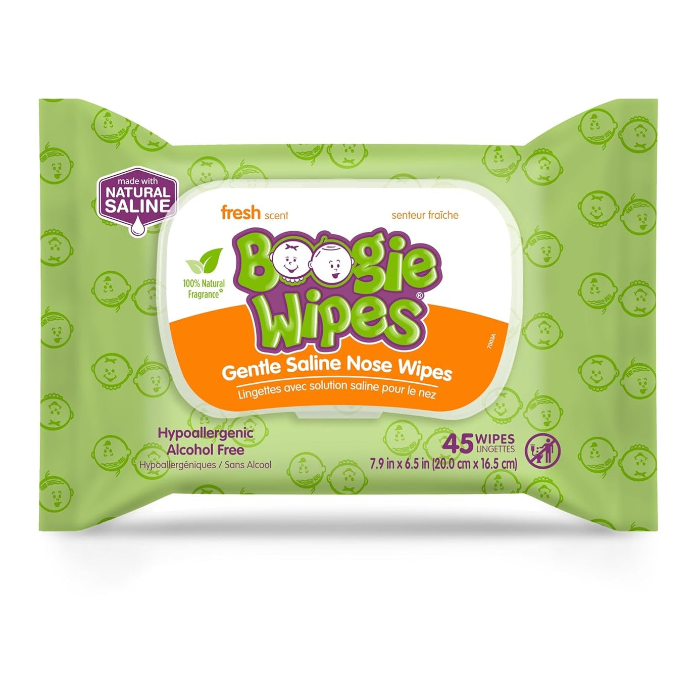 BABY WIPES: Boogie Wipes are wet wipes for baby and kids that are made with natural saline, which is gentle on skin, helps clean and dissolve snot and boogers, and wipes away dirt and germs They're gentle enough to be used on noses, faces, fingers and toes whenever cleaning is necessary