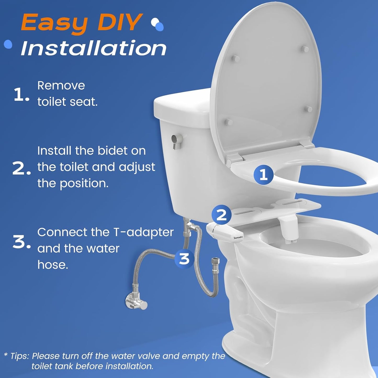 【Efficient & Durable】The SAMODRA bidet is made of environmentally friendly ABS material. Attached accessories are brass T-shaped adapter and braided steel cold water hose. In case of problems, the most effective way is to find our after-sales support.
