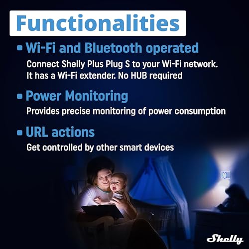 - Monitor and control home devices with Shelly Plus Plug S, featuring a high-capacity 12A power output.